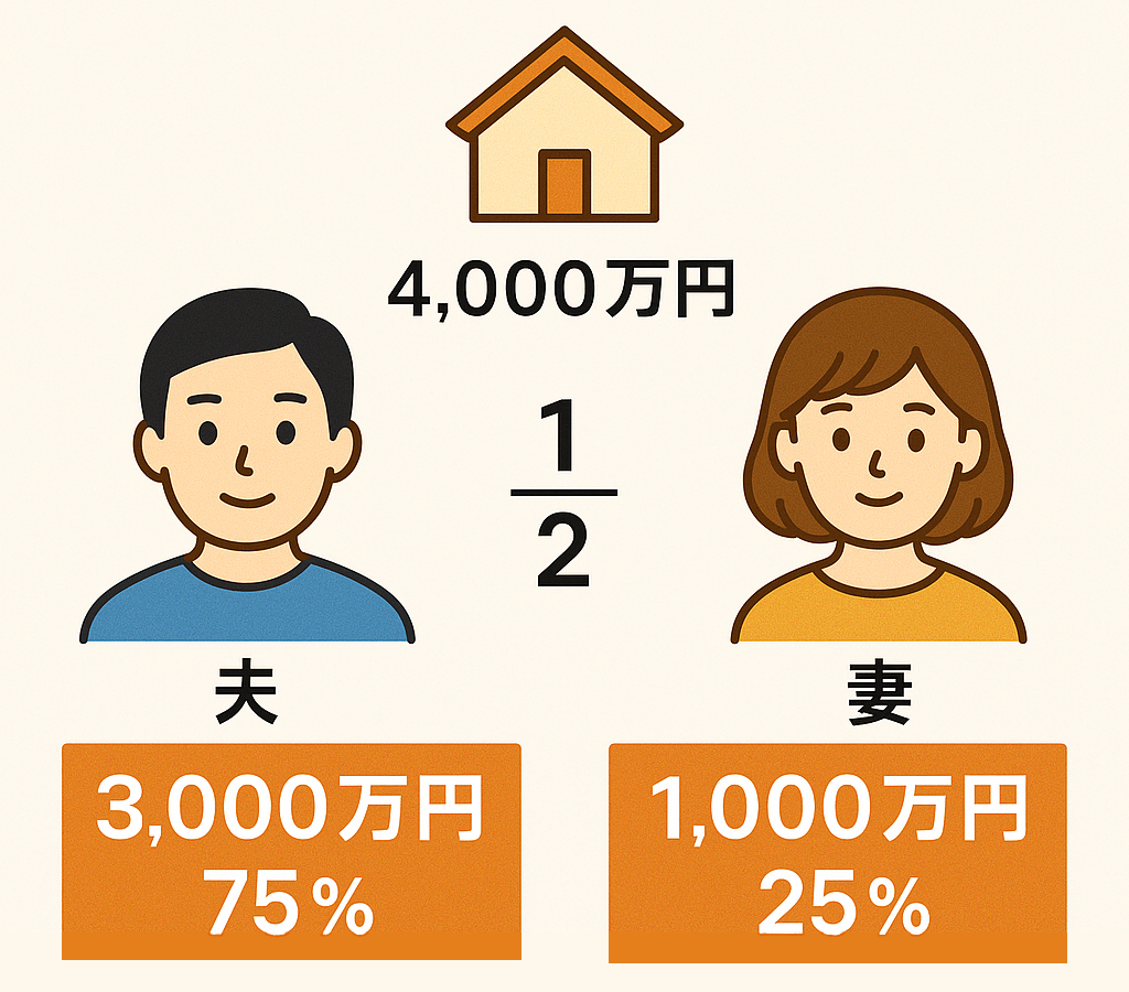 具体的な例を挙げるとすると、4,000万円の物件を購入し、夫が3,000万円、妻が1,000万円を負担した場合、本来の持分は「夫75%・妻25%」となります。