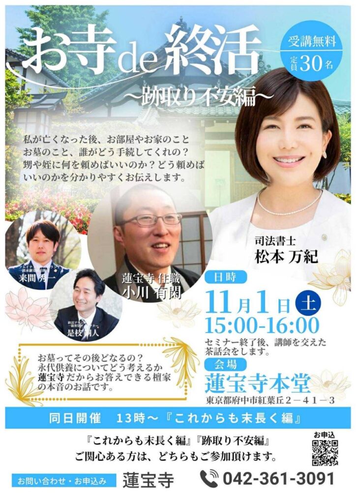 2025年11月1日(土)、府中市の蓮宝寺様にて、弊所代表・松本が「お寺de終活 ~これからも末長く編~・~跡取り不安編~」と題し、檀家の皆さま向けに相続や生前対策を含めた終活セミナーを講演いたしました。