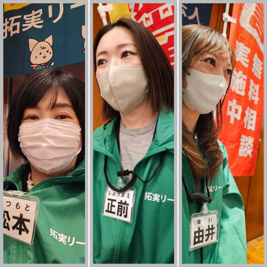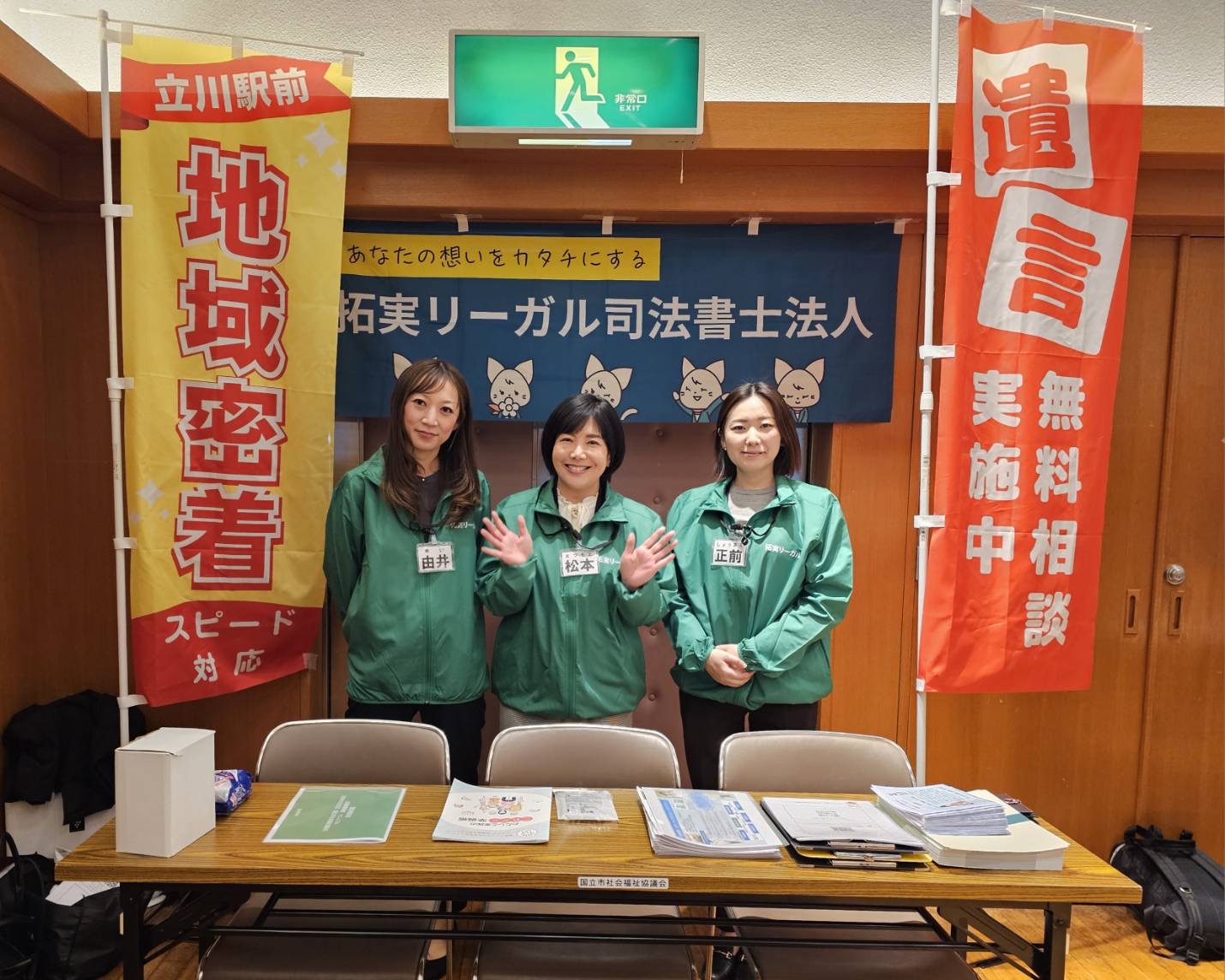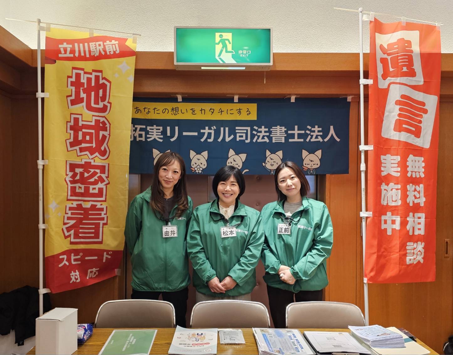 弊所は本イベントにあわせ、拓実リーガルのコーポレートカラーである「緑」のジャンパーを新調し、のぼりとともにブース出店を行いました。